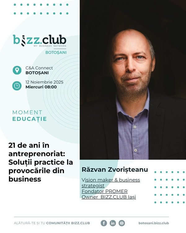 Miercuri, 12 noiembrie, la BIZZ.CLUB BOTOȘANI, îl are invitat pe Andrei Răzvan Zvorișteanu – antreprenor cu peste 20 de ani de experiență și fondator al PROMER®, DEVOS – Educație de business și Owner BIZZ.CLUB Iași.