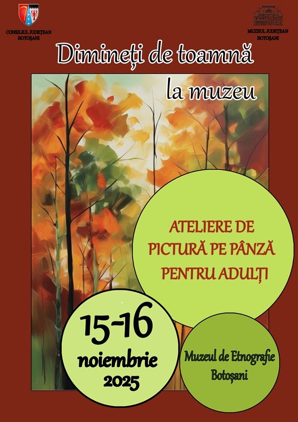 Muzeul Județean Botoșani vă invită, în perioada 15-16 noiembrie 2025, în intervalul orar 10.00 – 13.00, la ateliere de pictură pe pânză dedicate adulților pasionați de artă și de frumos. Acestea sunt concepute atât pentru începători, cât și pentru cei care au deja experiență artistică.