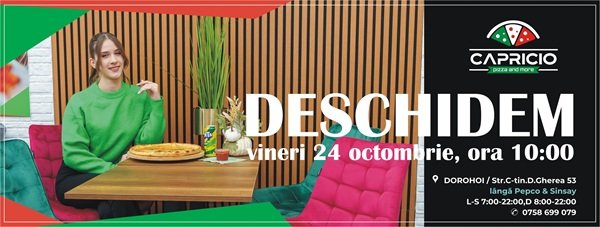 VINERI 24 OCTOMBRIE, ora 10:00 – MAREA DESCHIDERE!!! Capricio – pizza and more vă invită alături de ei, cu familia sau prietenii, să savurați o pizza italiană autentică, o shaorma din carne de pui, un burger proaspăt sau un delicios cappuccino – la #CAPRICIO, cea mai nouă locație din Dorohoi.