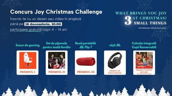 Centrul lingvistic Twinkle Star organizează o nouă ediție a concursului de limba engleză „Joy Christmas Challenge” pentru copiii între 4 – 14 ani din întreaga țară. Participarea este gratuită, iar înscrierile se fac exclusiv online până pe 18 decembrie 2025.