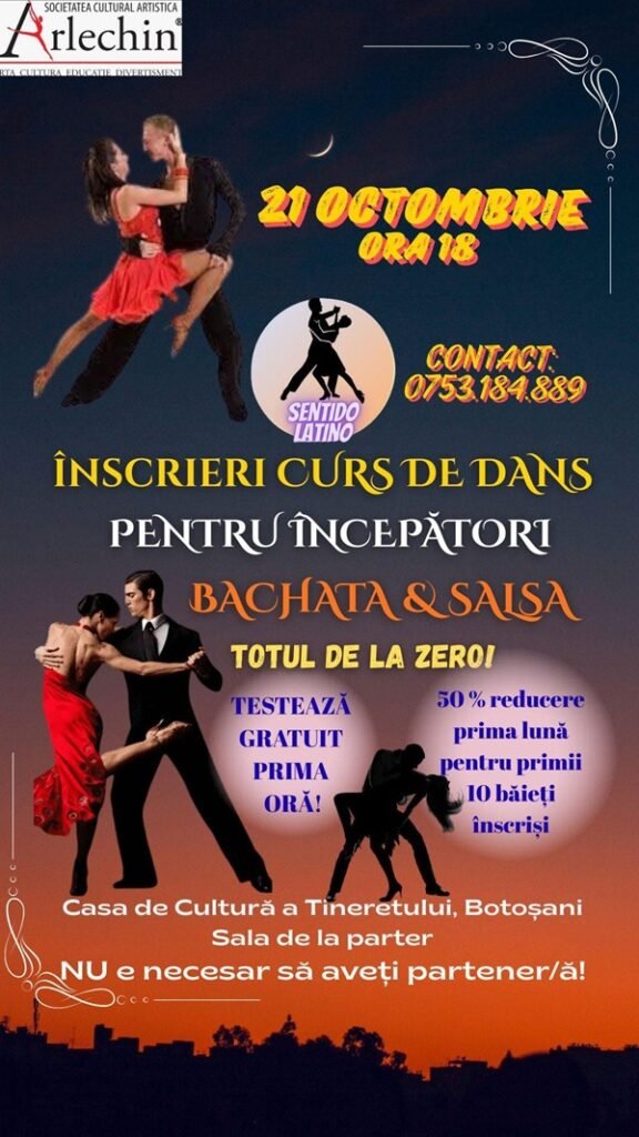🤗Îndrăznește și vino marți, pe 21 octombrie, ora 18, la Casa Tineretului, sala de la parter, din Botoșani, pentru a ne cunoaște și a descoperi împreună acest univers plin de sensibilitate, emoție și mișcare. Nu ezita, dă-ți o șansă și vei constata în scurt timp că un sens latino în viața ta îți va transforma rutina într-una colorată și sănătoasă.