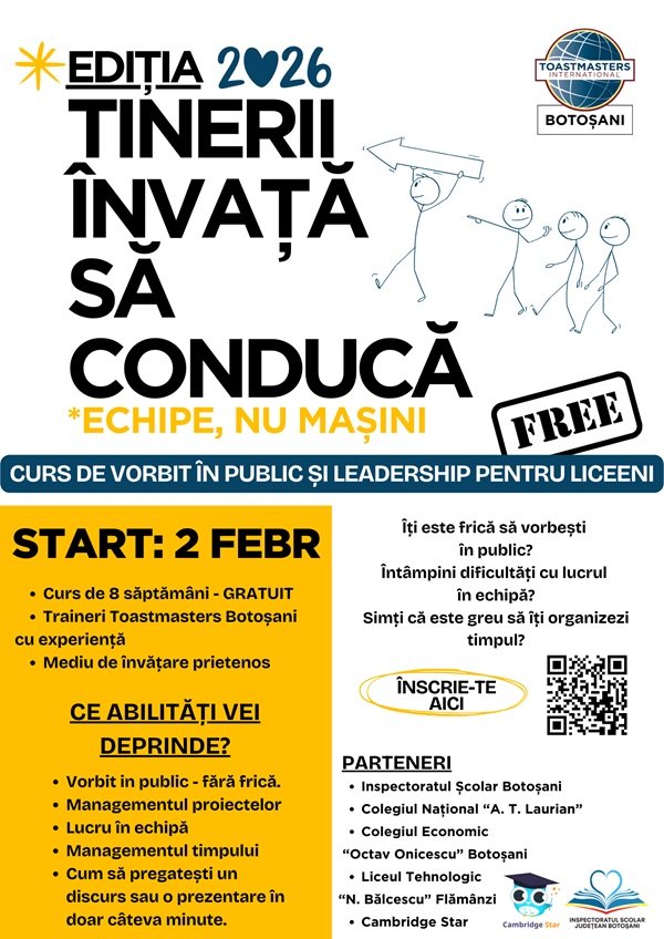 În februarie 2026 începe o nouă ediție a programului educațional „Tinerii învață să conducă”, aflat deja la a patra ediție consecutivă în județul Botoșani. Cursul de vorbit în public și leadership s-a dovedit a fi, de la o ediție la alta, mult mai mult decât atât: o experiență de învățare care îi ajută pe adolescenți să capete încredere, claritate și curajul de a se exprima autentic.
