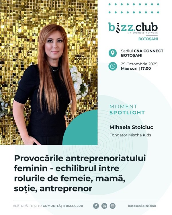 Săptămâna aceasta, la BIZZ.CLUB BOTOȘANI, o puteți cunoaște pe Mihaela Stoiciuc , fondatoarea Mischa – activitati tip creșă, grădiniță, after-school , într-un moment de spotlight despre 𝐜𝐮𝐫𝐚𝐣, 𝐯𝐮𝐥𝐧𝐞𝐫𝐚𝐛𝐢𝐥𝐢𝐭𝐚𝐭𝐞 𝐬̦𝐢 𝐝𝐞𝐭𝐞𝐫𝐦𝐢𝐧𝐚𝐫𝐞.