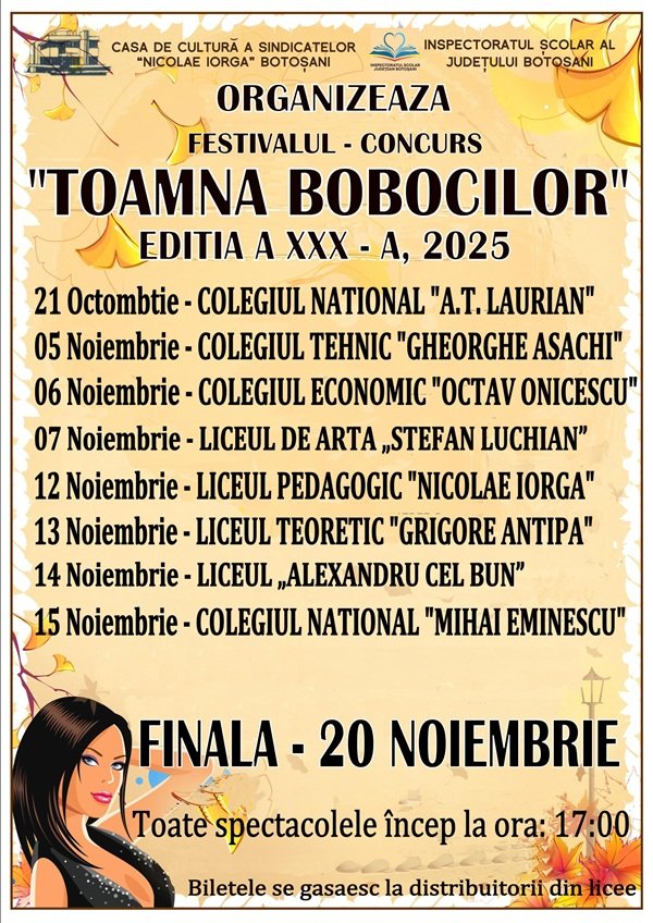 În perioada 21 octombrie – 15 noiembrie, Casa de Cultură a Sindicatelor din Botoșani va găzdui evenimentul intitulat „Toamna bobocilor”, aflat la ediția a 30-a. Este vorba despre concursul Miss și Mister Boboc organizat de liceele botoșănene.